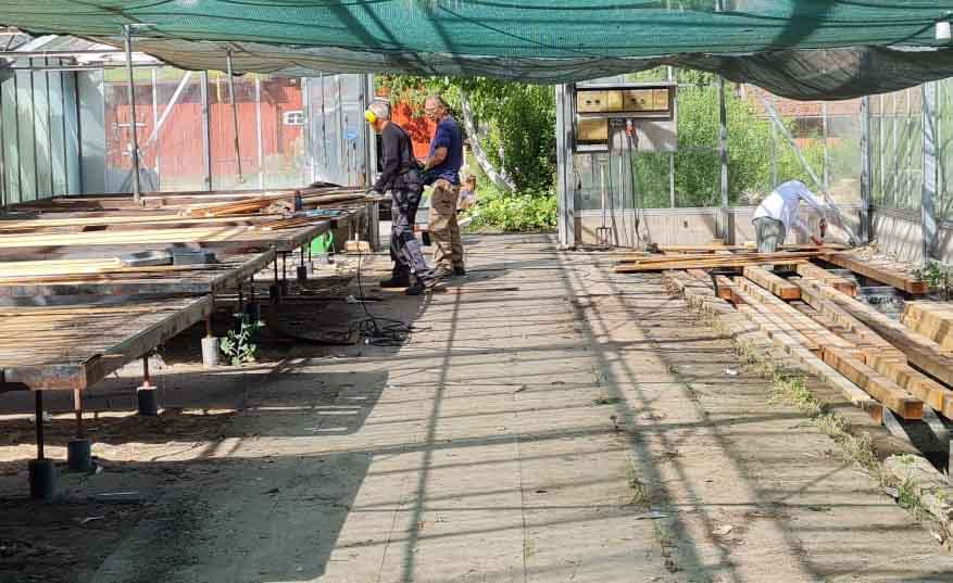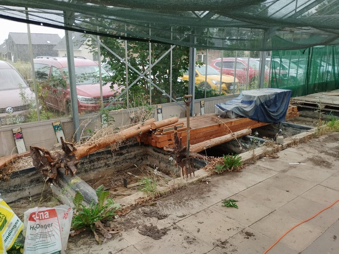 Alles Material konnte wieder verwendet werden. Die Holzplanken von den Pflanztischen auf der einen Seite wurden verwendet, um die Becken für Wasserpflanzen auf der anderen Seite abzudecken, und zu einem begehbaren Fußboden umzugestalten.