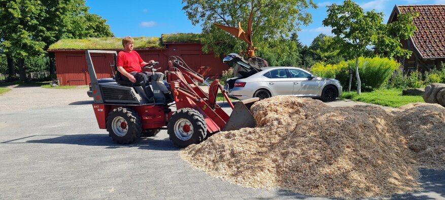 Mit dem Radlader wurde ein Hänger voll Hackschnitzel auf der anderen Seite von Matthias verfüllt.