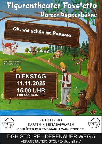 nach Stolpe kommt, um unseren Kindern tolles Puppentheater zu bieten. So auch in diesem Jahr. Am Dienstag, den 11. November wurde auf der Bühne im DGH das Stück "Oh wie schön ist Panama" gespielt, nach dem beliebten Kinderbuch von Janosch. Spieldauer etwa eine Stunde, für Kinder zwischen drei und zehn Jahren.