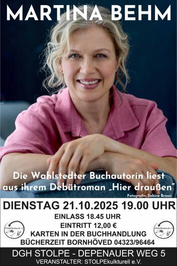 Im Frühjahr 2025 erschien der vielbeachtete und hochgelobte Debütroman „Hier draußen“ der Wahlstedter Autorin Martina Behm. Darin erzählt sie von einem Hamburger Ehepaar, das sich in einem Holsteiner Dorf einen Resthof kauft und anschließend versucht, in der Dorfgemeinschaft Fuß zu fassen. Und während Lara und Ingo sich langsam in ihrem neuen Leben auf dem Land einrichten, entwirft Martina Behm ein hinreißend liebevolles Portrait des Dorfes und seiner Menschen. „Für alle, die Lust auf einen vielschichtigen und warmherzigen Dorfroman haben“ (Christine Westermann, WDR) In Zusammenarbeit mit der Buchhandlung Bücherzeit in Bornhöved haben wir Martina Behm zu einer Lesung nach Stolpe eingeladen.