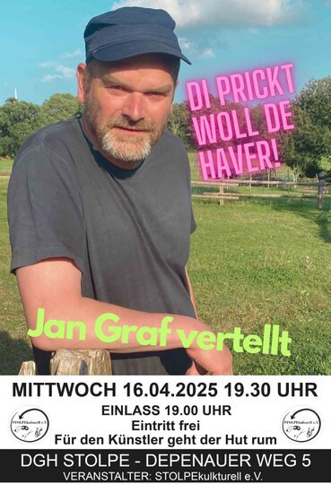 Der plattdeutsche Erzähler, Liedermacher und Entertainer Jan Graf kommt wieder mal nach Stolpe, um dem geneigten Publikum mit seinen Geschichten und Liedern einen unvergesslichen Abend zu bereiten. Bekannt aus der legendären NDR-Sendung „Hör mal`n beten to“ und ausgezeichnet u.a. mit dem Niederdeutschen Literaturpreis der Stadt Kappeln, läuft Jan Graf auf der Bühne regelmäßig zu großer Form auf, vertellt, spielt Gitarre, singt und pfeift, dass es eine wahre Freude ist. Nun gastiert er mit seinem aktuellen Programm „Di prickt woll de Haver!“ nach einigen Jahren Pause mal wieder im DGH, und zwar am