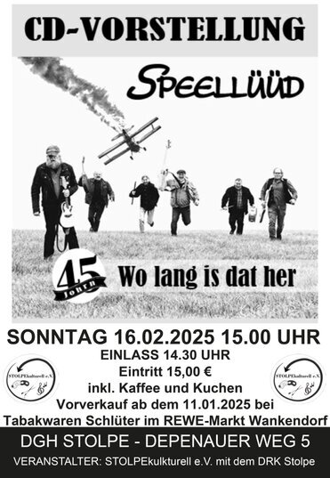 Das Konzertjahr in Stolpe ging fulminant weiter. Seit 45 Jahren steht die Holsteiner Band „Speellüüd“ – ausgezeichnet mit dem Medienpreis des Schleswig-Holsteinischen Heimatbundes – für Folk`n`Rock op Platt. Anlässlich dieses Bandjubiläums haben sie ein neues Album aufgenommen, welches sie im Rahmen einer kleinen Tour durch den Norden präsentieren – auch in Stolpe. Auf Einladung von STOLPEkulturell und dem Stolper Ortsverein des DRK spielen sie am Sonntag, den 16. Februar um 15 Uhr im Dorfgemeinschaftshaus Stolpe im Depenauer Weg. In der Pause gegen 16 Uhr gibt es Kaffee und Kuchen.