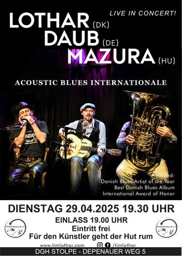 Begleitet wird Tim Lothar von Holger Hobo Daub und Janos Mazura. Holger Hobo Daub aus Hamburg spielt eine wandlungsfähige, mal gedrosselte, mal mitreißende Mundharmonika, während Janos Mazura aus Budapest ein international anerkannter Jazz- und Klassik-Tubist ist. Er spielte u.a. an der Staatsoper Istanbul und im Symphonieorchester Budapest. Seine besondere Liebe gilt aber dem Jazz und dem Blues, dem er mit seinem kräftigen Tubaspiel große Dynamik verleiht. Dieses grandiose Trio kommt nun erstmals nach Stolpe.